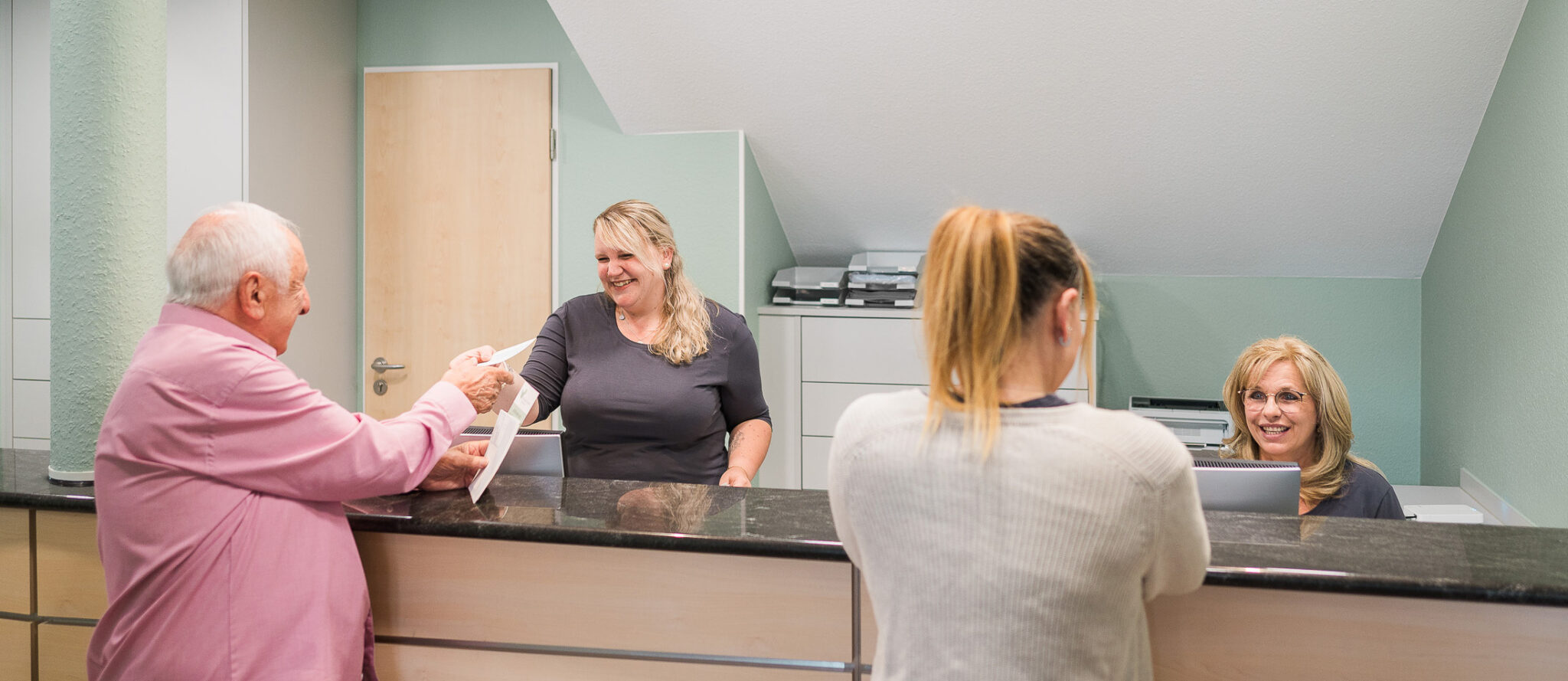 Direkt links im Eingangsbereich steht Ihnen in Kürze auch ein Selbst-Check in zur Verfügung. Sie können sich hier durch Einlesen Ihrer Krankenkassenkarte selbst zu Ihrem vorher vereinbarten Termin bei uns anmelden. So umgehen Sie den Anmelde-Tresen und reduzieren Ihre Wartezeit.